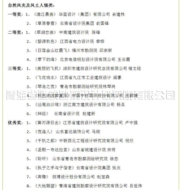 近期,根據中國勘察設計協會《關于公布首屆全國勘察設計行業(yè)攝影大賽獲獎名單的通知》(中設協字[2015] 52號),我院生產經營部主任呂世偉同志提交的參賽作品《大地雕塑》獲自然風光及風土人情類優(yōu)秀作品獎,這是我院自建院以來,在全國舉辦的有影響的攝影比賽中實現的又一新突破,特向獲獎者表示祝賀!