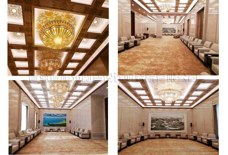 人民大會(huì)堂青海廳根據(jù)全國(guó)人民大會(huì)堂管理局安排重新調(diào)整位置,需要重新裝修改造。新青海廳位于人民大會(huì)堂Ⅱ段三層?xùn)|南角,北側(cè)與人民大會(huì)堂金色大廳和三層小禮堂相對(duì),南側(cè)面向人大辦公樓內(nèi)院。位置與金色大廳和小禮堂位置靠近,原功能為領(lǐng)導(dǎo)人休息廳。青海廳總建筑面積350平方米,會(huì)議廳平面尺寸為29.3米×8.0米狹長(zhǎng)的空間,建筑內(nèi)表面積為222.68平方米,廳內(nèi)原設(shè)計(jì)設(shè)變形縫,中間約2/5處設(shè)框架柱,吊頂高度5.0米左右,周邊設(shè)有服務(wù)間、衛(wèi)生間、配電間等服務(wù)設(shè)施。原裝修為2000年裝修改造工程。廳室尺寸為一狹長(zhǎng)空間,長(zhǎng)寬比達(dá)到1:3.67,空間比例很不協(xié)調(diào),為改造裝修工程帶來(lái)較大的難度,也是改造工程的重點(diǎn)。